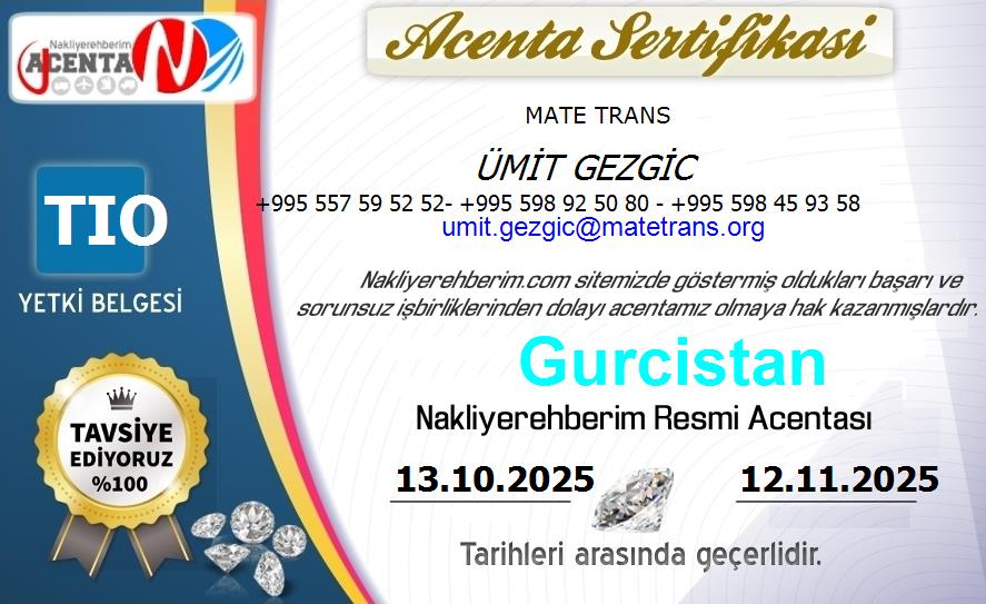 Yetkili Kişi: ÜMİT GEZGİC Telefon: +995 557 59 52 52 Gsm: +995 598 92 50 80 - +995 598 45 93 58 E-Posta: umit.gezgic@matetrans.org |