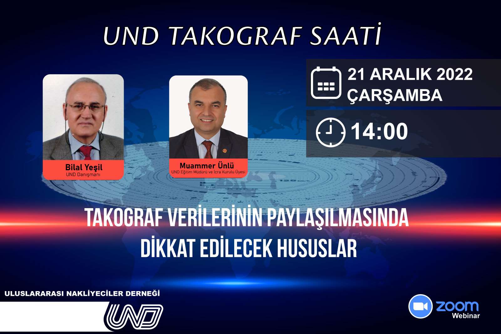 UND Ailesi olarak Takograf konusunda lojistik sektörüne yönelik bugüne kadar yapmış olduğumuz bilgilendirme faaliyetlerine 21 Aralık 2022 Çarşamba günü saat:14:00’te yapacağımız “Takograf Verilerinin Paylaşılmasında Dikkat Edilecek Hususlar” adlı webinarımızla devam ediyoruz.