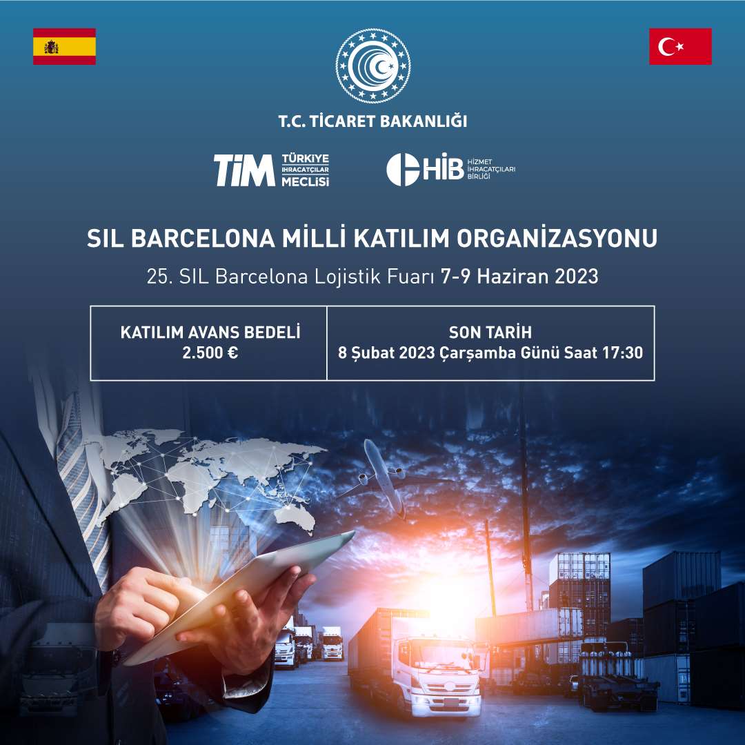 7-9 Haziran 2023 tarihleri arasında İspanya’nın Barselona şehrinde lojistik ve taşımacılık hizmetlerine yönelik “25. SIL Barcelona Lojistik Fuarı” Milli Katılım Organizasyonu düzenlenecektir.
