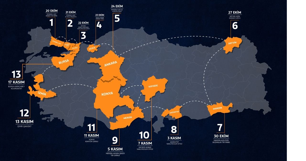20 Ekim 2025: İstanbul Avrupa Yakası, Erdem TIR Parkı 21 Ekim 2025: İstanbul Anadolu Yakası, Bi Mola Reşadiye 22 Ekim 2025: Kocaeli, Gebze Marmara Nakliyeciler Sitesi 23 Ekim 2025: Düzce, Türsan Dinlenme Tesisi 24 Ekim 2025: Ankara, Yurt İçi Lojistik Üssü 27 Ekim 2025: Artvin, Hopa Esenkıyı Köyü 30 Ekim 2025: Mardin, Kızıltepe Bozanlar TIR Parkı 3 Kasım 2025: Gaziantep, Nakliyeciler Sitesi 5 Kasım 2025: Mersin, Hasan Şeker TIR Garajı 7 Kasım 2025: Kayseri, Ambar Nakliyeciler Sitesi 11 Kasım 2025: Konya, Kamyon Garajı 13 Kasım 2025: İzmir, Işıkkent 17 Kasım 2025: Bursa, Karacabey Kooperatifi