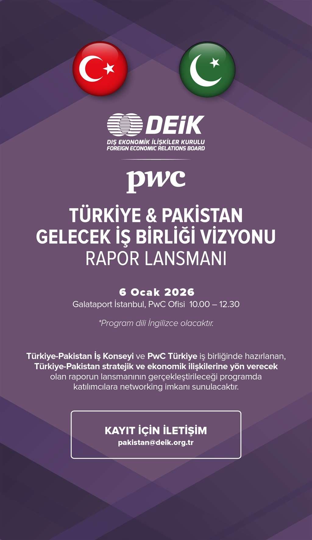 6 Ocak 2026 tarihinde, Galataport İstanbul, PwC Ofisi nde yapılacak olan Türkiye-Pakistan İş Konseyi ve PwC Türkiye iş birliğinde hazırlanan, Türkiye-Pakistan stratejik ve ekonomik ilişkilerine yön verecek olan raporun lansmanı İngilizce olarak gerçekleştirilecektir. Katılımcılara networking imkanı sunulacak programa kayıt linki için lütfen pakistan@deik.org.tr adresi ile iletişime geçiniz.
