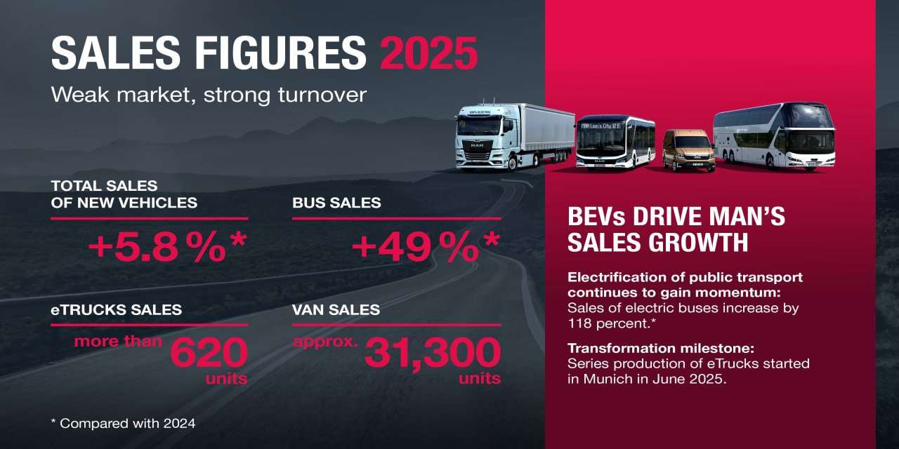 MAN, elektrikli araçların büyümeyi sürüklediği 2025 yılında tüm yeni araç segmentlerinde satışlarını yaklaşık %6 artırarak 101.600 adede ulaştırdı.