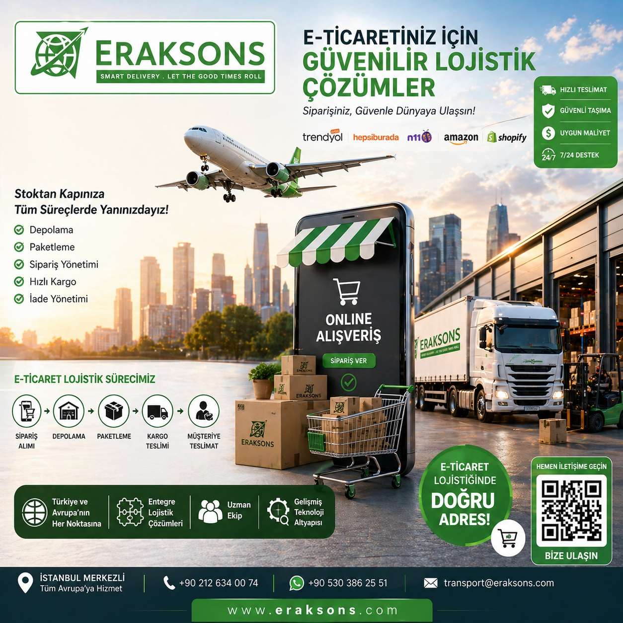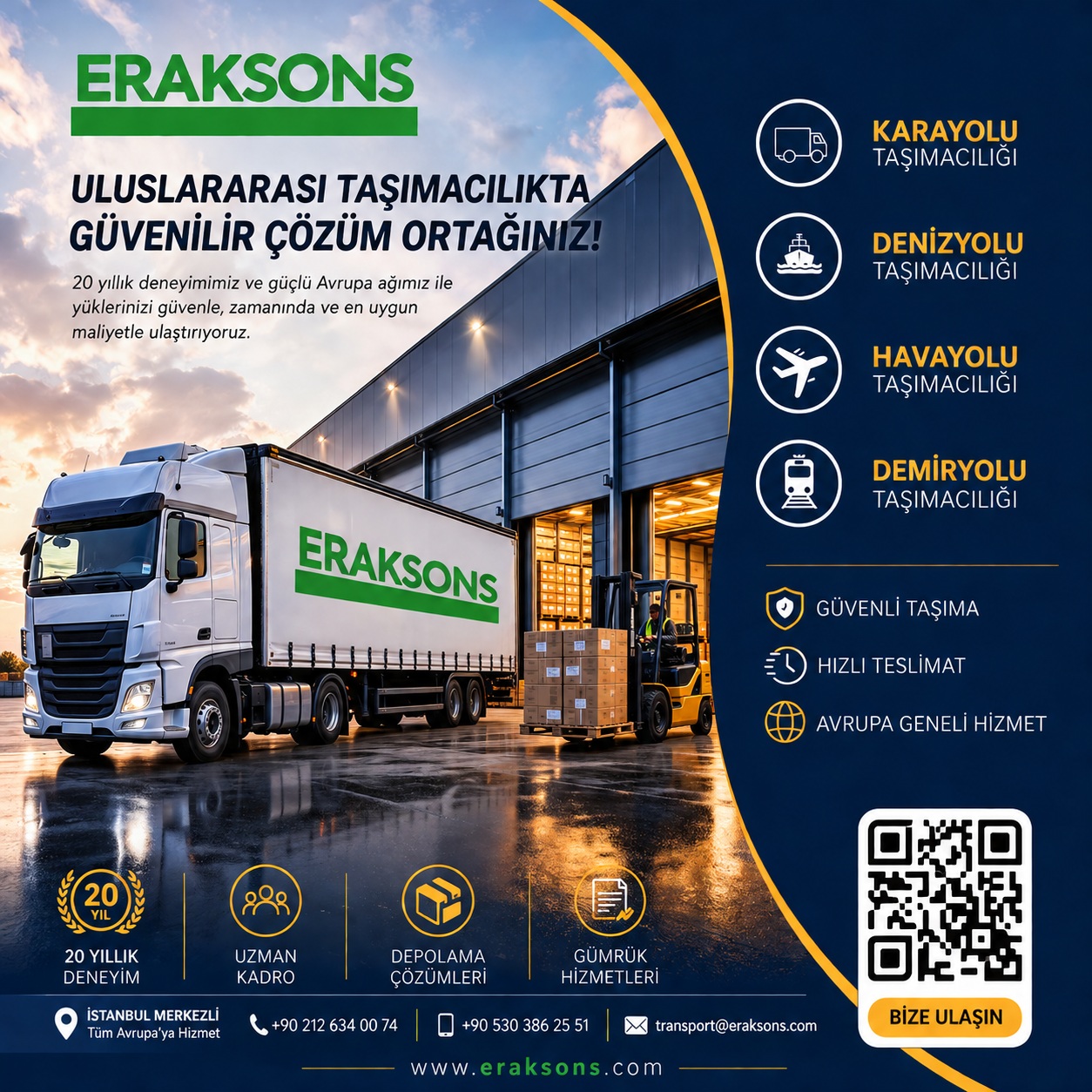 Eraksons Lojistik, depolama süreçlerinde de müşterilerine profesyonel çözümler sunar. Depolama hizmetleri kapsamında: Teslim alma ve yerleştirme Stok kontrol ve sayım Sipariş toplama ve paketleme Sevkiyat yönetimi titizlikle yürütülmektedir. Neden Eraksons Lojistik? 20 yıllık sektör deneyimi Türkiye – Avrupa güçlü lojistik ağı Tüm taşıma modlarında entegre hizmet Hızlı ve güvenilir teslimat Müşteri odaklı çözüm yaklaşımı Gümrük ve operasyon süreçlerinde uzmanlık İletişim Bilgileri Adres: Gültepe Mah. Zümrüt Sk. Yeşil Vadi Arsa Ofisi No:1 İç Kapı No:5 Küçükçekmece / İstanbul – Türkiye Telefon: +90 212 634 00 74 Mobil: +90 530 386 25 51 E-posta: transport@eraksons.com Sonuç Eraksons Lojistik, uluslararası taşımacılıkta sunduğu kapsamlı hizmetler, güçlü altyapısı ve uzman kadrosu ile müşterilerine güvenilir bir çözüm ortağı olmaya devam etmektedir. Karayolu, denizyolu, havayolu ve demiryolu taşımacılığını tek çatı altında sunan firma, dış ticaret süreçlerinizi kolaylaştırarak işlerinizi büyütmenize katkı sağlar. İhtiyacınıza özel lojistik çözümler için Eraksons Lojistik her zaman yanınızda.