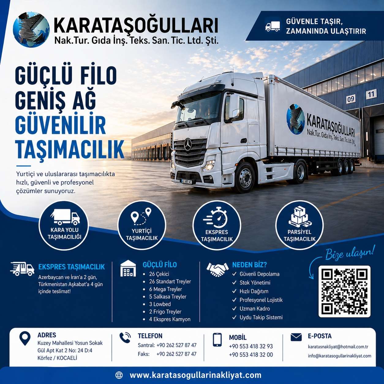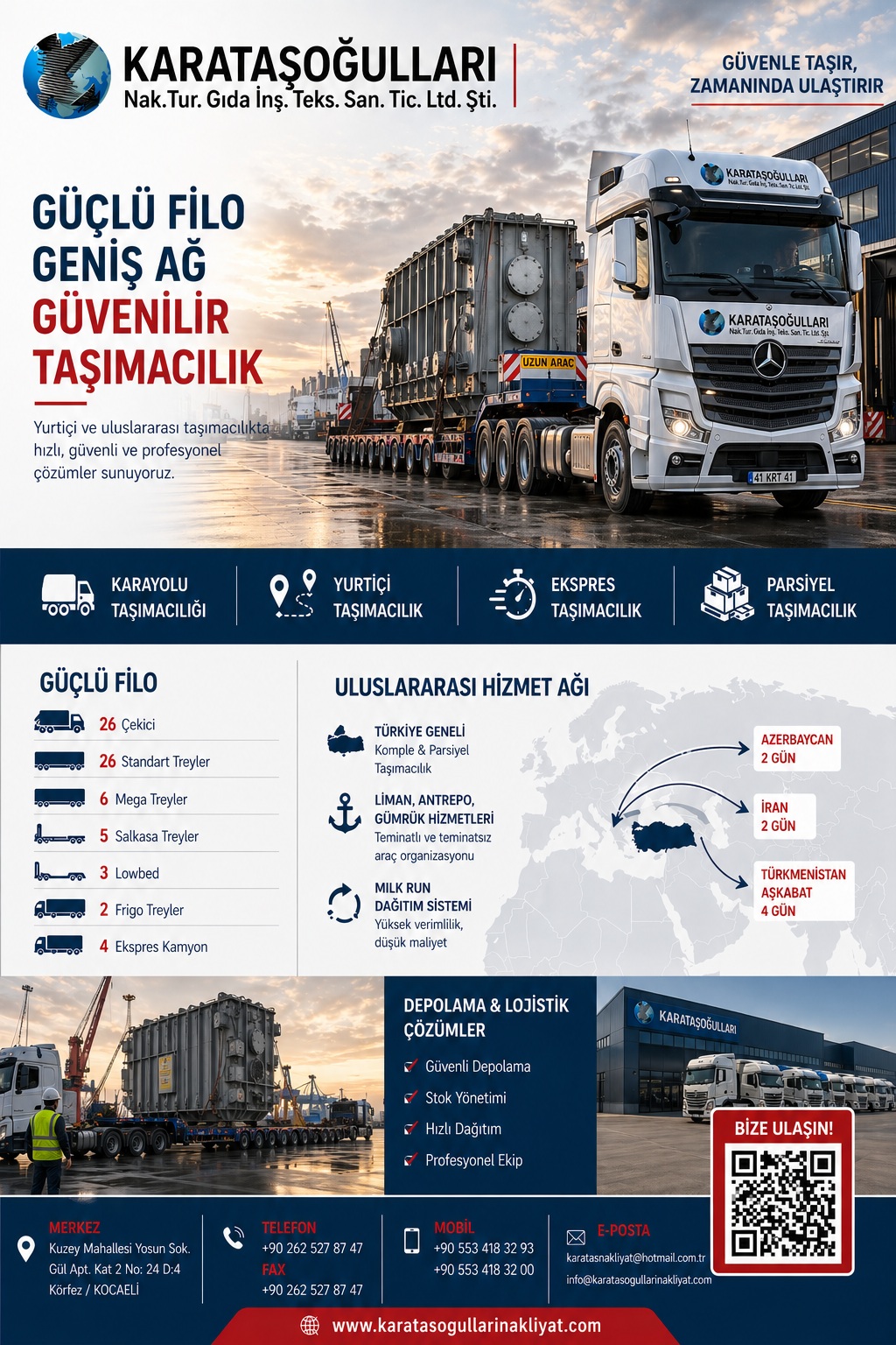 Karataşoğulları Nakliyat, özellikle İstanbul ve Kocaeli başta olmak üzere Türkiye’nin tüm illerine komple ve parsiyel taşımacılık hizmeti sunmaktadır. Limanlar, havaalanları, antrepolar ve serbest bölgelerden yapılan taşımalarda güçlü organizasyon kabiliyeti ile dikkat çekmektedir.