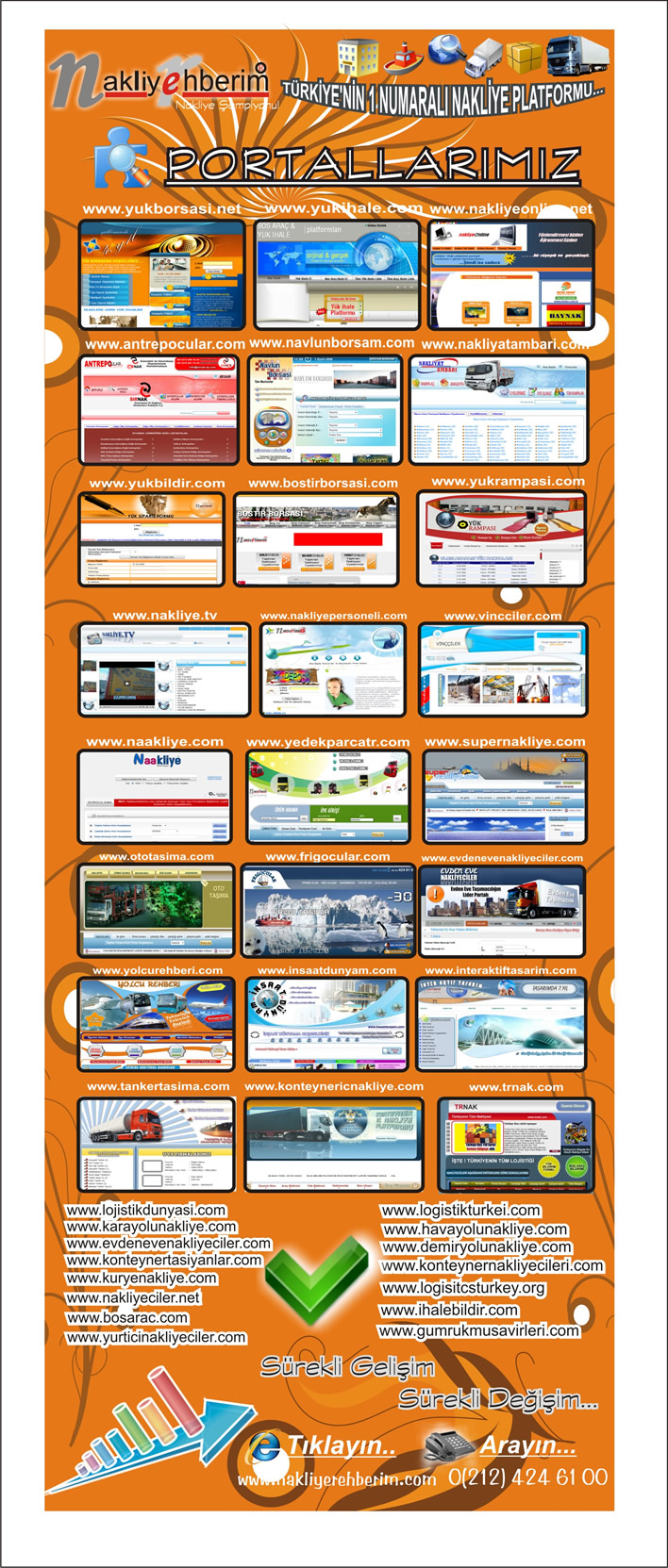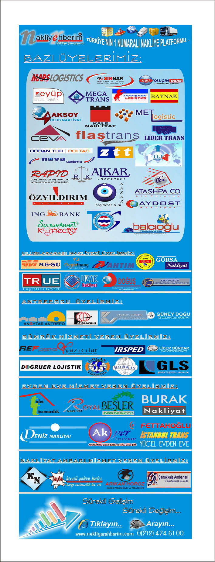 Sistem sayesinde dönüş araçlarını takip edebilir ve uygun nakliye fiyatlarına anında erişebilirsiniz. Yükünüzü taşıyan aracı sistem sayesinde 7x24 takip edebilir, müşterilerinize sevkiyat zamanınızı bildirebilirsiniz. Firmanıza ait sevkiyatlar ile ilgili tüm bilgilere anlık olarak www.nakliyerehberim.com sayfası üzerinden kendi kullanıcı adınız ile erişebilirsiniz. nakliyerehberim hizmelerimiz nakliyerehberim uyelerimizin tamamına yakınını sanalda daha etkili ve kurumsal gözükmelerini sağlamak amacıyla internet sitelerini reklam bannerlerını , tanıtım afişlerini ve 3 boyutlu logolarını yapmıştır ve yapmaya devam etmektedir. örnek vermek gerekirse