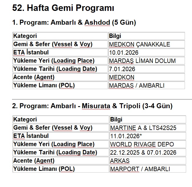 Konu: 52. Hafta Konteyner Gemi Programı ve Güncel Güzergah Duyurusu