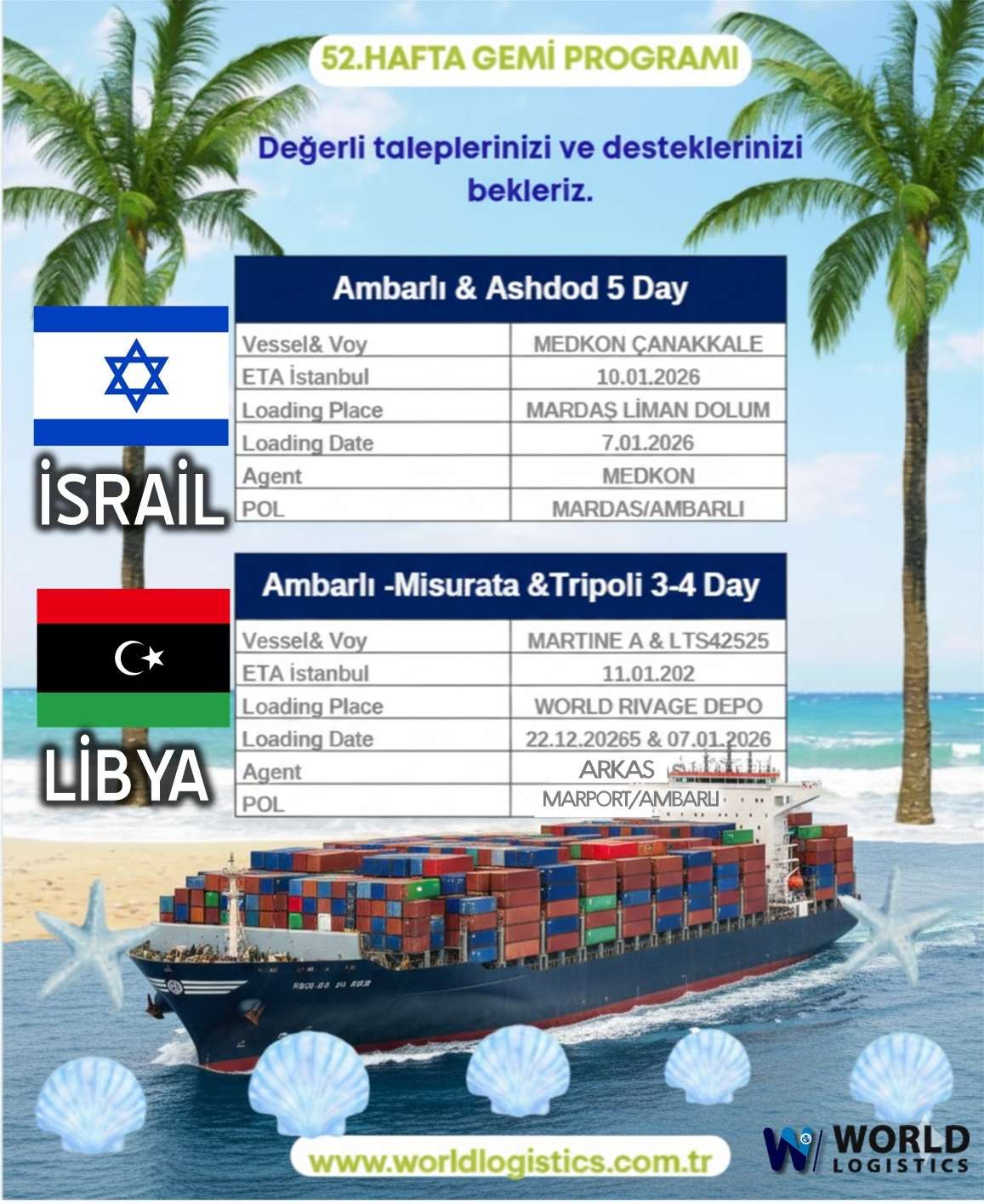 hafta konteyner gemi programımızın güncellendiğini ve operasyonel süreçlerimizin kesintisiz devam ettiğini bilgilerinize sunarız. Özellikle İsrail ve Libya hatlarımızda sunduğumuz avantajlı lojistik çözümlerimizle, sevkiyat süreçlerinize değer katmaya hazırız.